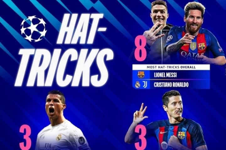 体育资讯07月11日讯 欧冠官方发布了欧冠历史上上演帽子戏法的各项纪录。